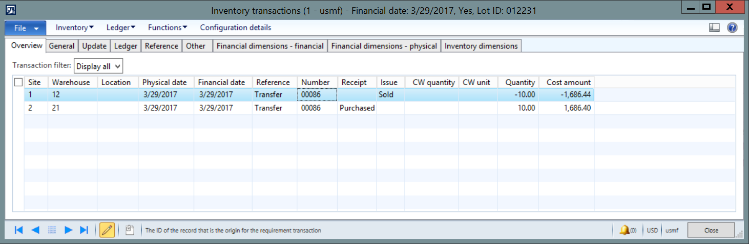 9. Check the Inventory transactions (Transaction status is 'Sold' for Site1/Warehouse 12 and 'Purchased' for Site2/Warehouse 21)
