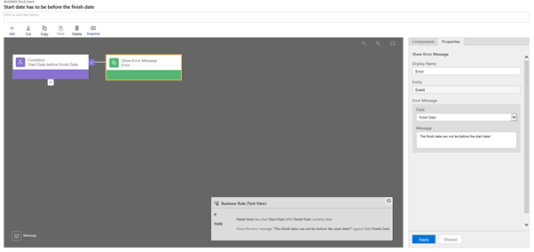 In Microsoft Dynamics 365 the creation process when creating a business rule is significantly different, in a good way! The business rules still use programming logic in a more visual and simplistic manner. Business rules are more than just business logic, they are extremely useful, and can be used to lock fields, hide fields and display errors on fields. I will walk through how to create a business rule to ensure that the end date for an event is after the start date, and to display an error message next to the field if it is not.