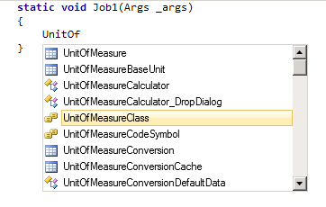 Suggestions are presented to the user while typing for types (tables, classes, extended data types, etc.), class members and methods, local variables, intrinsic and global functions, keywords. Namespaces and types from the referenced .NET assemblies are also suggested.