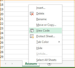 We have to click “View code” option from the context menu, by right clicking sheet name tab in Excel file.