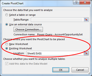 - From the Create PivotChart dialogue select the Worksheet onto which to place the chart and click OK.