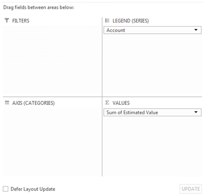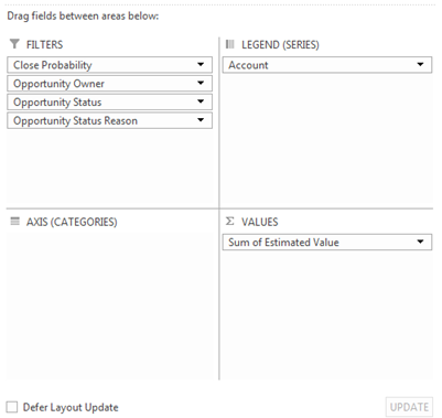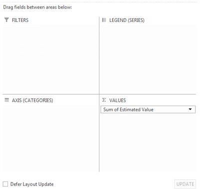- To configure the chart to display the Sum of Estimated Value drag-and-drop the Estimated Value field from the Fields List into the VALUES area.