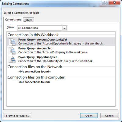 - From the Existing Connections dialogue, choose the Power Query – Account OpportunitySet from the list of Connections and click Open.