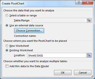 - From the Create Pivot Chart dialogue select the Use an external data source option and click Choose Connection.