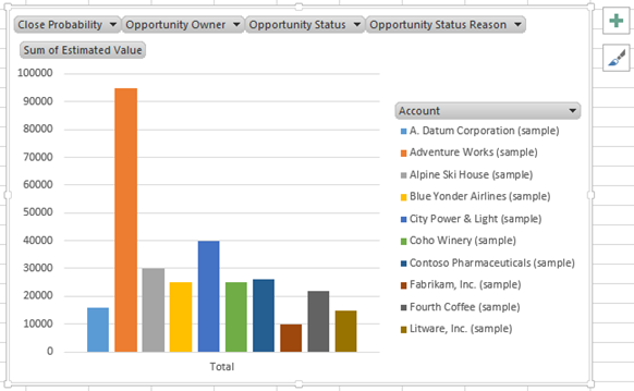 In this blog I will demonstrate how to create a simple Clustered Column Chart in Microsoft Excel to display Microsoft Dynamics CRM Online Sum of Estimated Value for Opportunities by Account. The chart is based on the AccountOpportunitySet query built using Power Query as demonstrated in the previous blogs in this series. This chart is filterable by Close Probability, Opportunity Value, Opportunity Owner, Opportunity Status and Opportunity Status Reason.