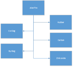 For Car tire (AlexTire) manufacturing we will need the following ingredients: Rubber, Carbon and Zink oxide. Please note that as the result of Car tire (AlexTire) manufacturing we will also have Co-Slag co-product and By-Slag by-product.