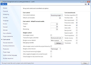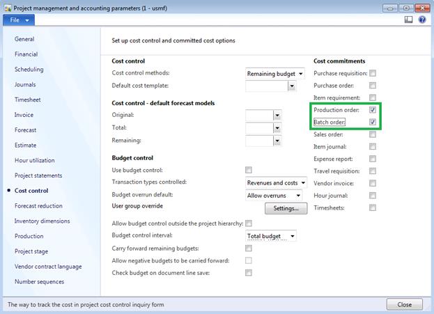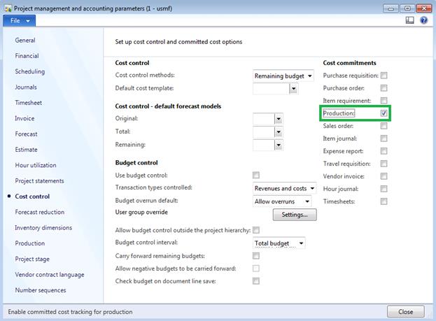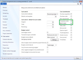 In order to track production costs under project via Cost control functionality we need to make sure that it is enabled in Project accounting parameters (Cost control tab > Cost commitments section > Production checkbox)