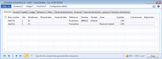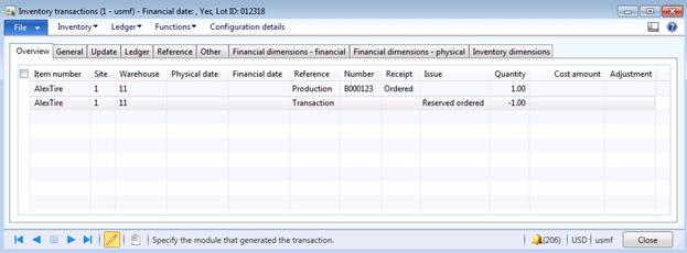 At this moment we will have inventory receipt transaction representing batch order receipt for Car tire (AlexTire) as well as auto loss/profit inventory issue transaction representing consumed to the project Car tire (AlexTire)