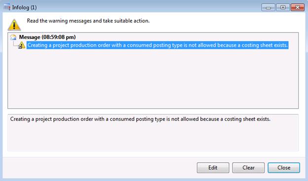 Please note that Costing sheet should not exist in case of Posting method = Consumed, otherwise you will see the following message upon project production order creation
