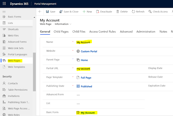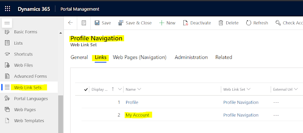 - For demonstration, I have created a new weblink (My Account) under Profile Navigation Web Link sets and associated it with My Account Web Page. Anf finally I have associated the My Account web page with the My Account Basic form.