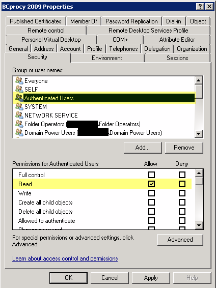 - In the "Group or User names"-field, scroll down and select "Authenticated Users"