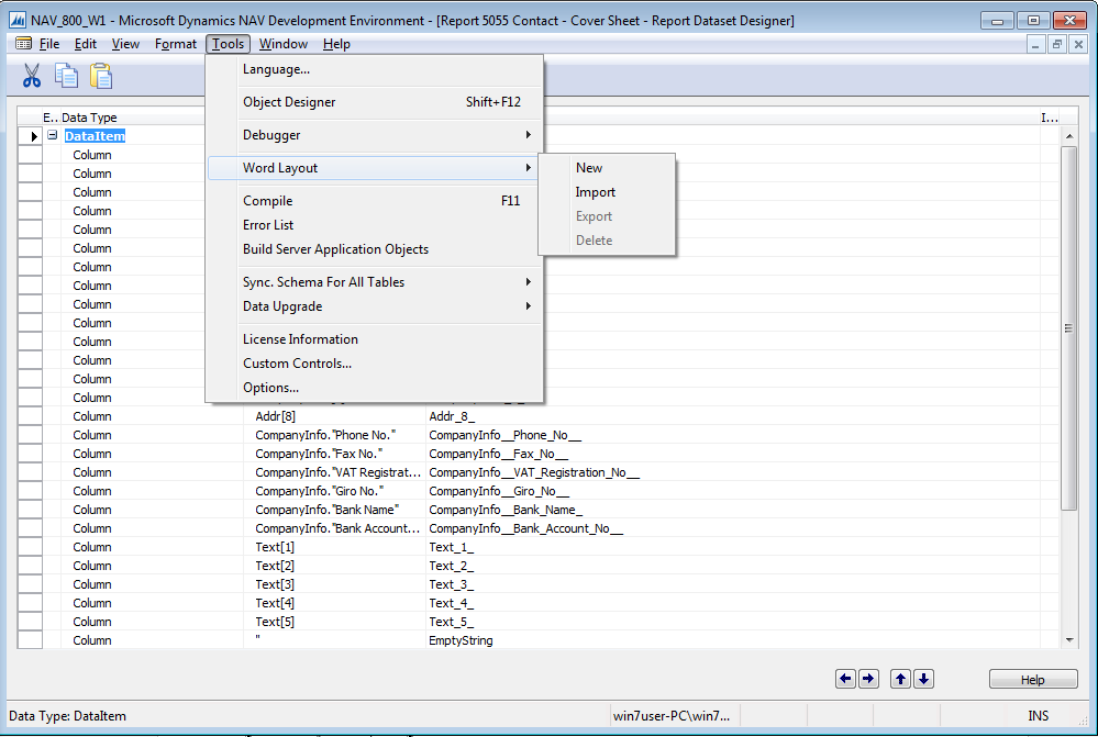 - From NAV 2015 report design, choose Tools > Word Layout > Import, and select the saved Word document.