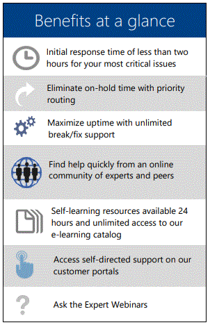 Dynamics 365 customers can also purchase something in-between - Enhanced Support for Dynamics 365, geared toward small businesses who do not purchase Premier support. This support offering provides many support and training benefits as listed below:
