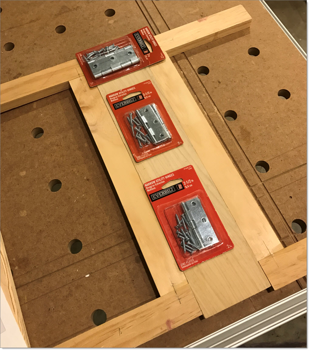 Then a quick run to Home Depot to pick up some hinges. If you want to get Extra Fancy, you could go with piano hinge for just a few dollars more, but I didn't want to spend time cutting the piano hinge, so I opted for the ugly utilitarian hinges.