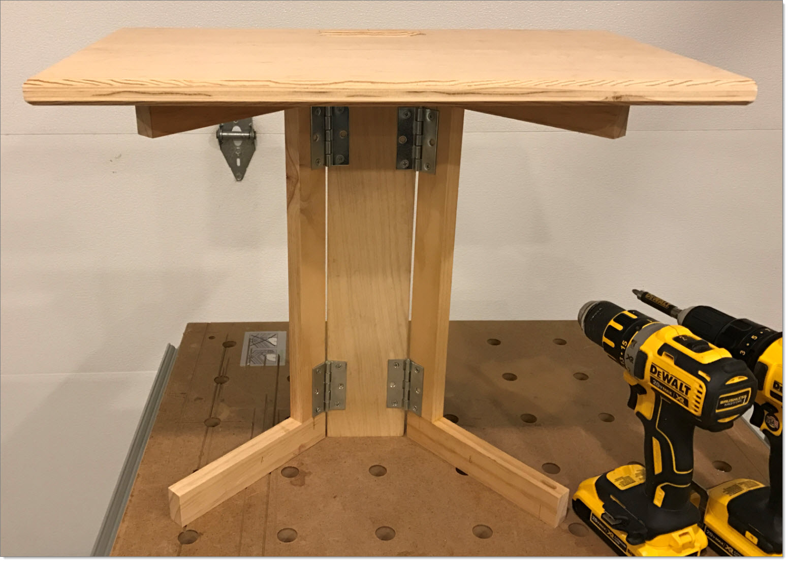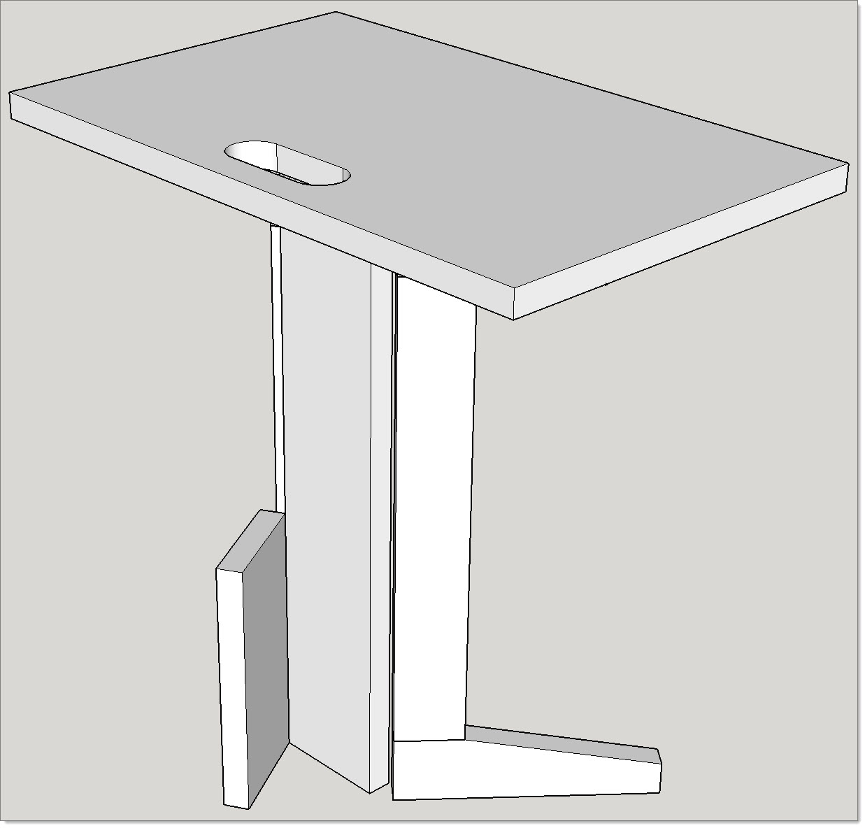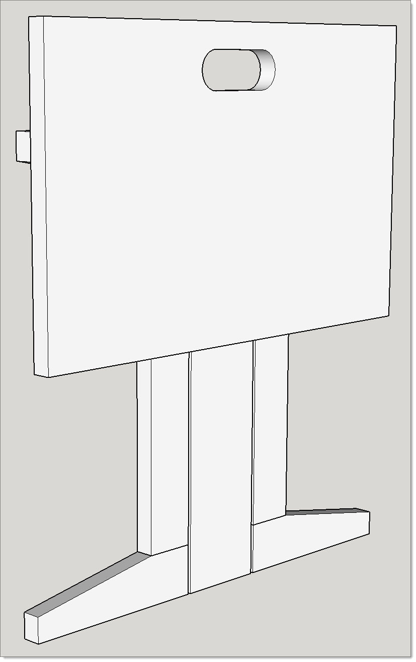 I fired up SketchUp and quickly came up with this simple design, which has a flat top and folding support legs. I wanted to keep it as simple as possible so that I could quickly build it this afternoon with as little wood and as little effort as possible.
