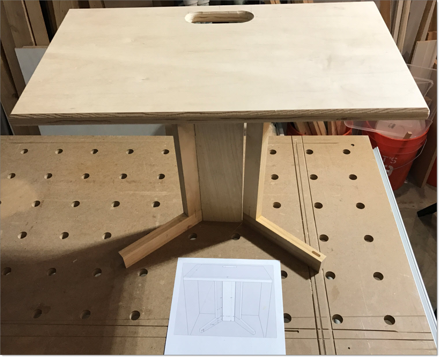 Fortunately, I had the perfect scraps for the project. I had a scrap of maple plywood that was almost exactly the dimensions of the top, a nice piece of poplar for the center back, and I had just enough select pine scraps for the folding legs.