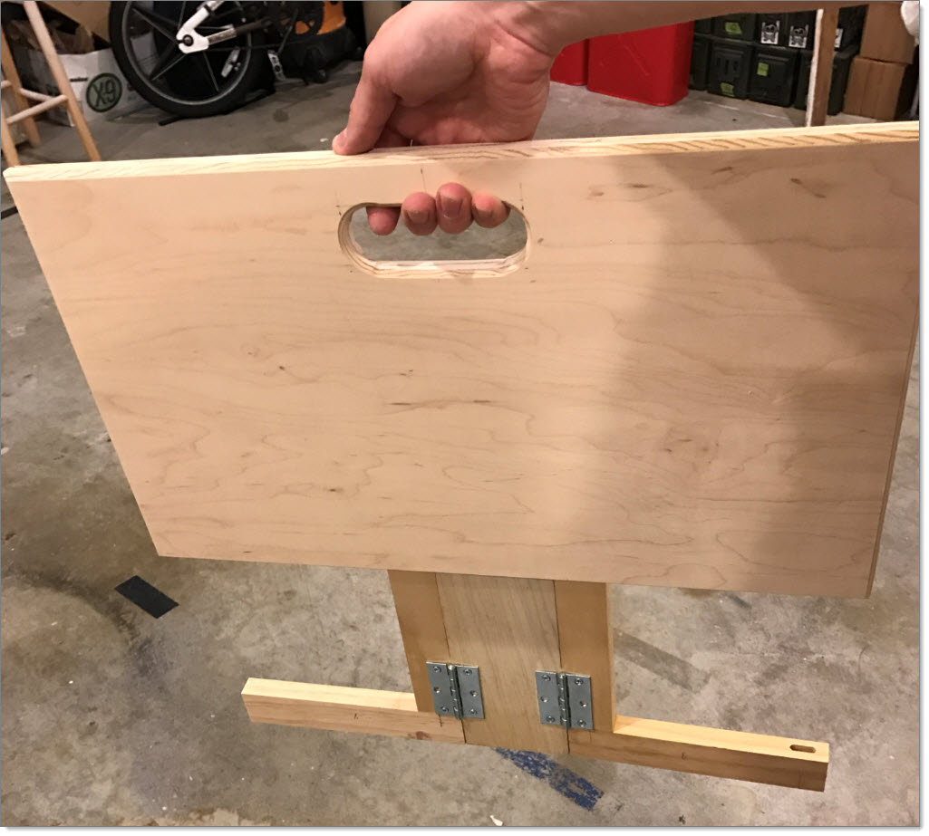 With the legs folded flat, the hinged top folds down flat, and the top has a convenient carry handle. I figured this would make it very easy to setup, and then I could fold it up in 2 seconds and easily store it out of the way, taking up minimal room.