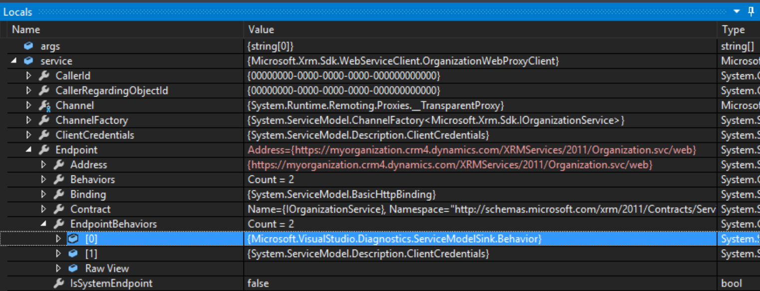 1 | var service = new OrganizationWebProxyClient(new Uri("https://myOrganization.crm4.dynamics.com/XRMServices/2011/Organization.svc/web"), false); |