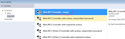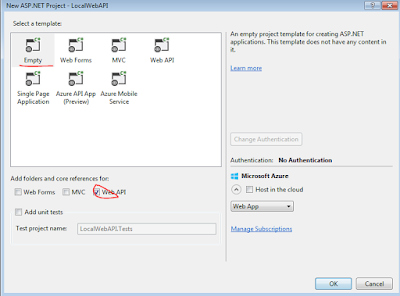 Select “Empty” template and check “Web API” from add folder and core reference folder.