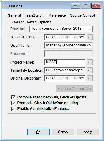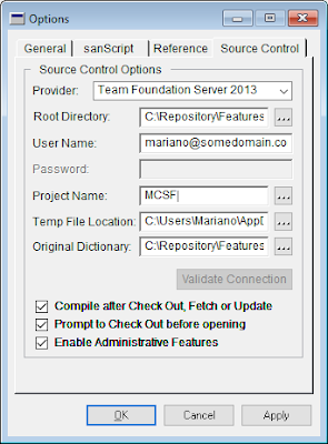 The rest of the setup happens in Dexterity, where it is necessary to edit the source control settings to point to the online repository. Dexterity 12 (12.00.0323.00), Dexterity 14 (all builds), and Dexterity 16 (all builds) have native support for a Team Foundation Server provider -- I guess, it is worth mentioning that the Dexterity Source Code Control Service (DSCCS) has been deprecated in favor of the much more robust providers.