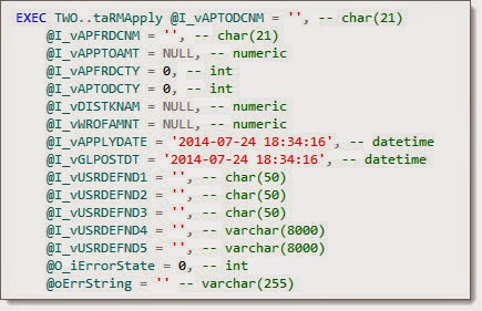 This morning, when I was working on the eConnect AP apply script, I just typed "EXEC taRMApply" and it automatically wrote the parameters for the stored procedure.