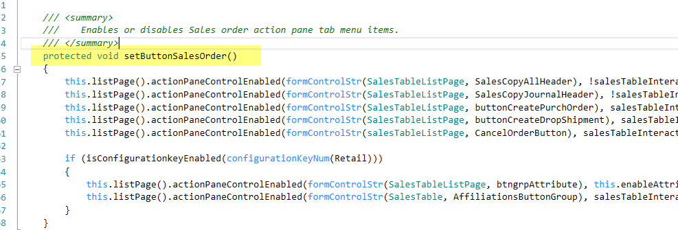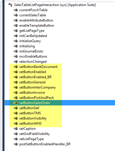 That means we need to subscribe to the method of the interaction class. We can see that interaction class as methods available which are pretty much self-explanatory by their names. We can see there are few methods which set the button properties As we added the button in the sales order action pane group we can see that there is a method in this class which used to set buttons on the sales order action pane tab menu items . Notice that this is a protected method.