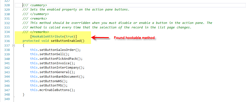 Let's find a hookable method in the interaction class: On a quick scan in the class you can see that the setButtonEnabled() method is a protected method and decorated with the "HookableAttribute" as true.