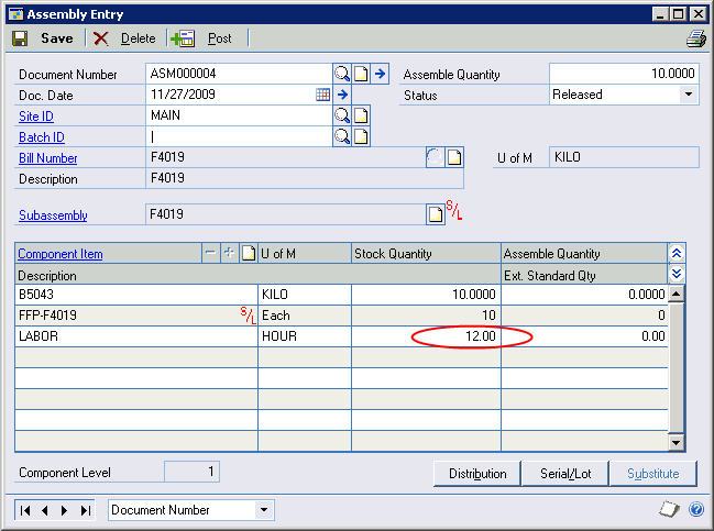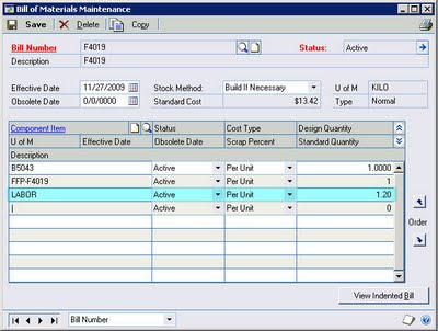 Next, go to the IV BOM Maintenance window and add the LABOR item as a component with the appropriate Quantity (number of hours).
