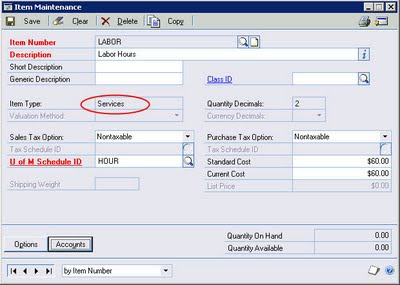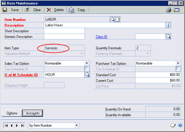 Set your other required fields as desired and set a Current Cost per unit of Labor. You can also set a Standard Cost to use as a comparative value as the Current Cost changes. The Standard Cost won't be used in any transactions - only Current Cost. Then, click the 'Accounts' tab and set your accounts