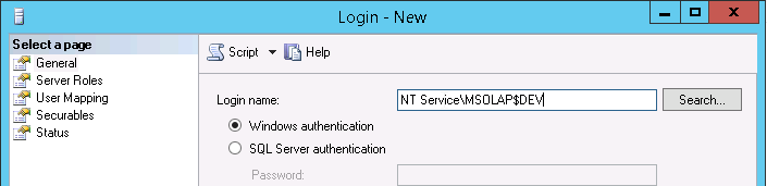 Now open SQL Server Management Studio, open Security and Logins. Add a new Login and paste in the Account name from previous step as the Login name.