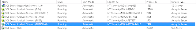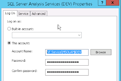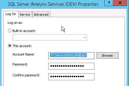 Open the properties and copy out the "Account name" which the service runs under. Normally this would be something like "NT Service\MSOLAP$INSTANCE_NAME" (INSTANCE_NAME refers to the name of the SSAS instance).