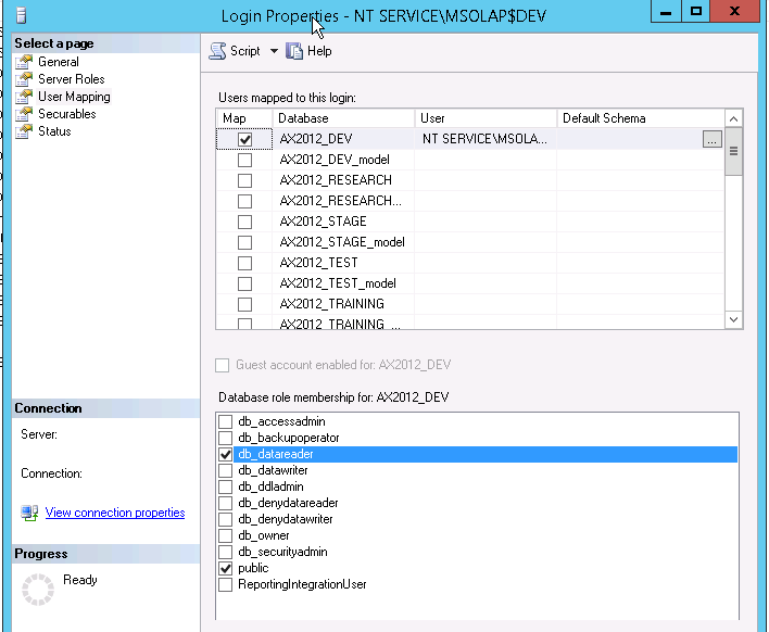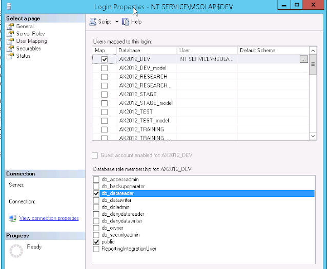 Before you save this new login, open "User Mappings" and find the Dynamics AX database you are trying to use as source for your OLAP. Tick the checkbox in front of the database name and grant the login "db_datareader" role membership.