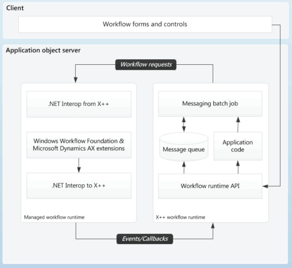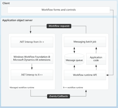 | 2 | Managed Workflow Runtime | .NET Interop from X++ receives the message and starts a new workflow instance through Windows Workflow Foundation. This workflow instance performs a callback function to the X++ workflow runtime API through .NET Interop to X++ CIL and posts a message that the workflow has started. After posting the message, the managed workflow runtime saves the idle workflow instance to the Microsoft Dynamics AX database. Runtime then removes it from memory. When the managed workflow runtime receives another message from the X++ workflow runtime for this workflow instance, it restores the workflow instance to memory and resumes it. Each workflow instance is unique. If you have two users who submit their expense reports for approval, two workflow instances are started. |
