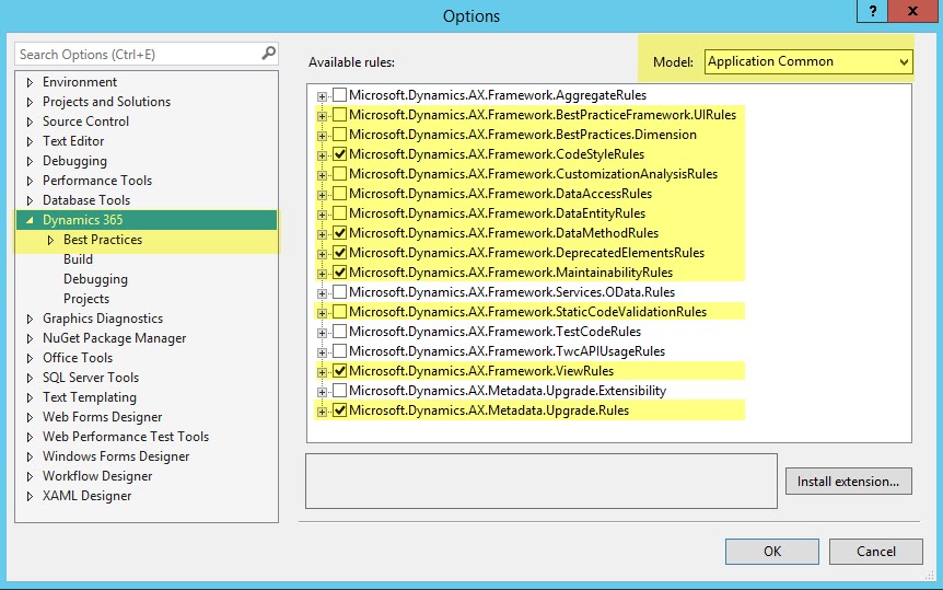 Few settings The definition of best practice rules set is per model, by default it is set to Application Common model and can be switched between different models from combo box in the upper right corner.