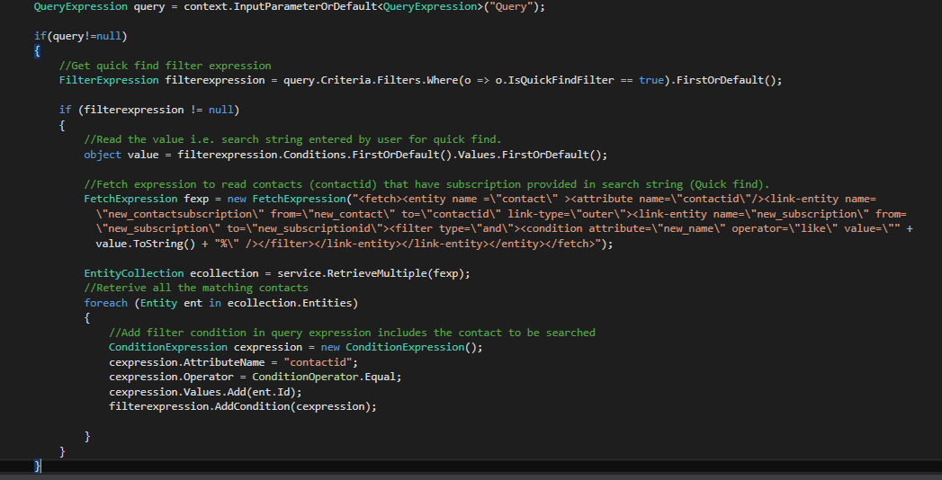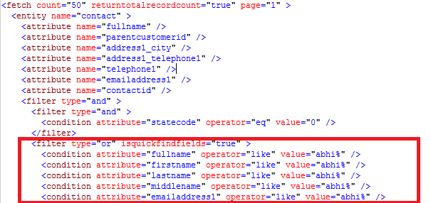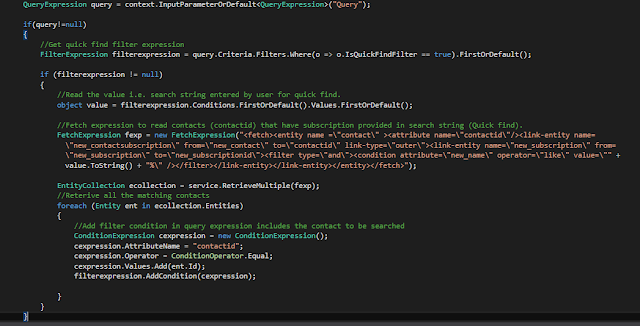Before we go on implementation its better to know that how CRM executes the Quickfind view? Internally CRM creates a query expression contains view and search columns with isquickfindfields property set true in filter condition. If you convert Queryexpression to FetchExpression the XML would look like as given below. You can extract Queryexpression by profiling Plugin on ReteriveMultiple step.