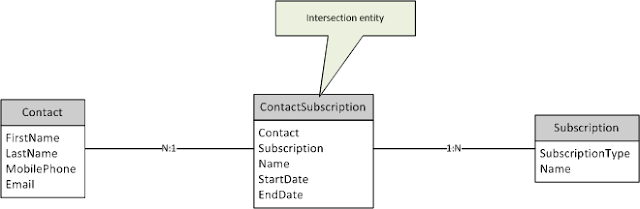 In given ER diagram "Contact"and "Subscription" have N:N relationship through an intersection entity "ContactSubscription".