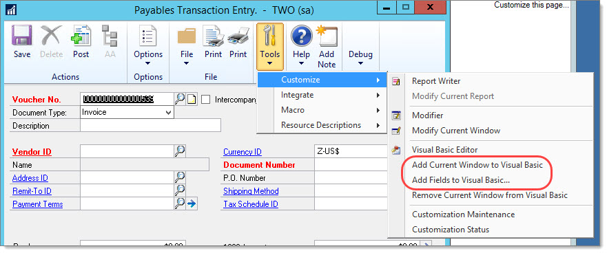 First, within Dynamics GP, you add the desired windows to Visual Basic by clicking on Tools -> Customize -> Add Current Window to Visual Basic.