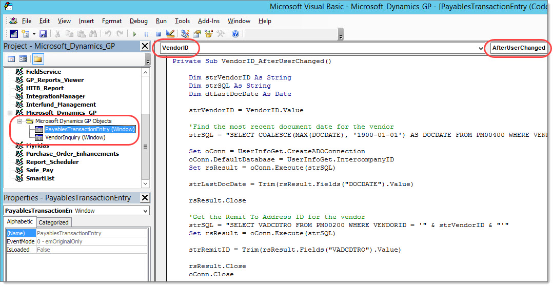 In the VB Editor window, I'll select the PayablesTransactionEntry window on the left, then select the VendorID field and the AfterUserChanged event.