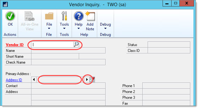 Since I am assuming that the user entering invoices will not have access to edit vendors or vendor addresses, I'm going to add the Vendor Inquiry window to Visual Basic and add 3 fields on the Inquiry window to VB: Vendor ID, Address ID, and the Address ID Next button.