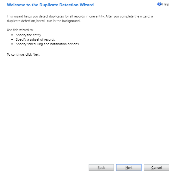 Duplicate Detection Wizard: The wizard helps to detect duplicates for all records in one entity.