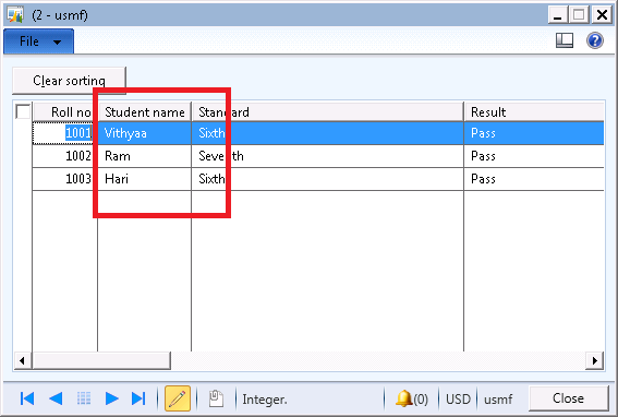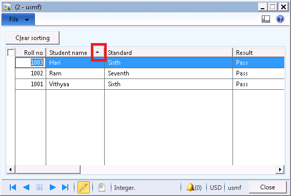 Sorting is the most important thing when display the data to the user. The user mostly prefers sorting functionality in the grid forms. AX 2012 has inbuilt functionality to sort the records in the grid by simply clicking the header of the grid column. Multiple sorting is not supported in the AX 2012. For example sort the fields by class and student name. Only single field sorting functionality is working in AX 2012.