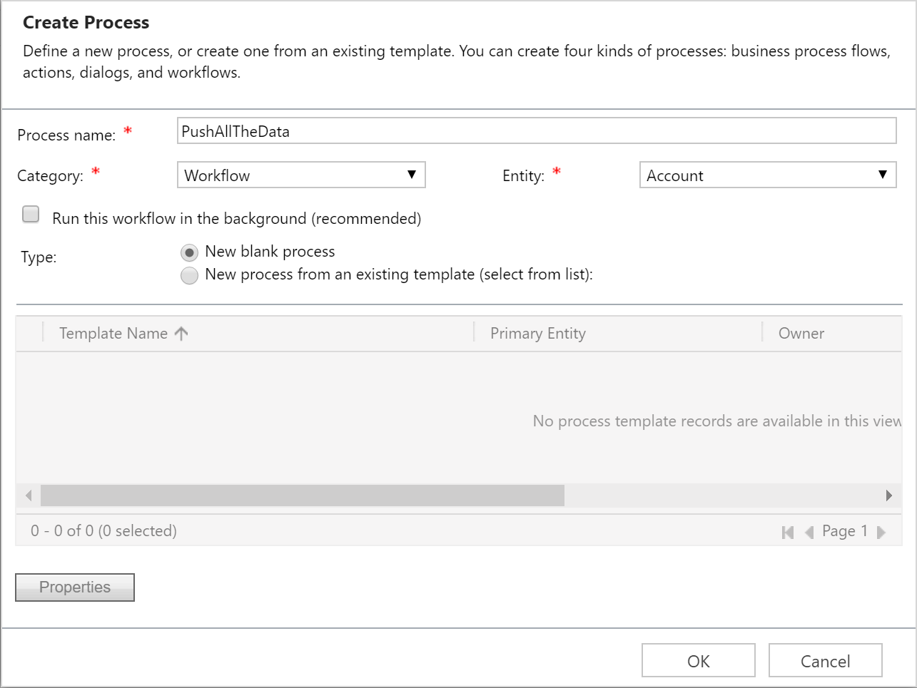The next step is to start using our new workflow step inside MSCRM. Just go into Settings -> Processes and hit New to create a new process. I like to start out with a synchronous one just to make sure that everything works, and then switch to background when I know it's OK. Even though you can run this step synchronously I wouldn't do it. The network latency alone is enough to make it a bad experience for users, so I would put much effort into using it as a background WF.