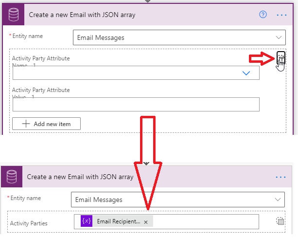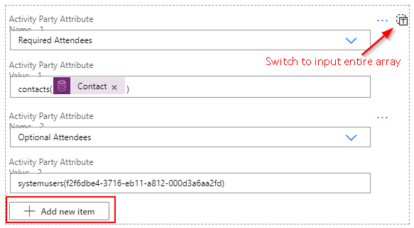 Finally, populate the JSON array variable to the Activity Parties input parameter by switching to input entire array.