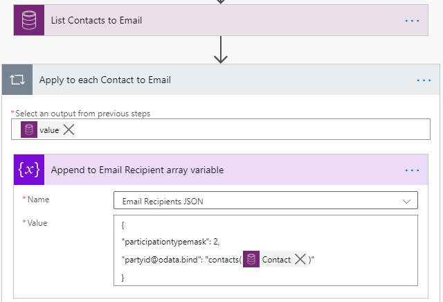 Next, append each Contact GUID from the "List record" action output into the array variable with ParticipationTypeMask = 2 for To Recipient activity party type.3. Create Email with JSON Array