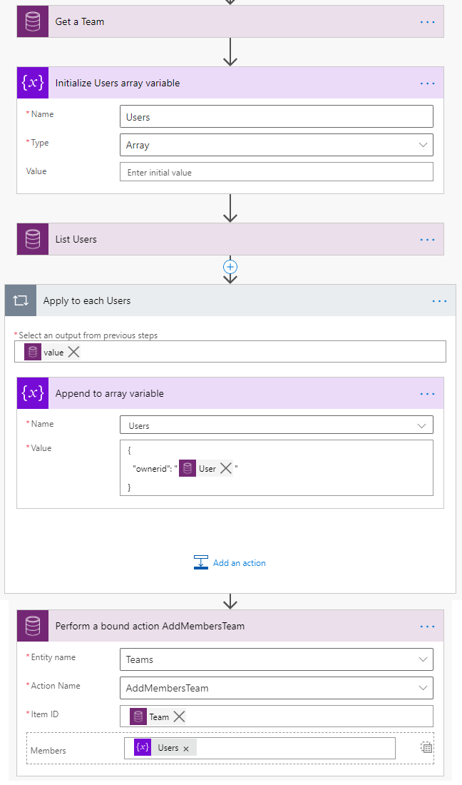 Not only for Activity Parties, but this approach can also be done for any other parameters which accept JSON array object (allow switching to input entire array). In the sample cloud flow below, multiple users are added to the team with a single AddMembersTeam bound action step which accepts Members parameter as JSON array. As similar to the flow above, we can dynamically add the team members by appending the User GUID to the array variable and set it as the Members parameter.