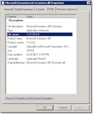 Right click on the eConnect.dll file and select Properties. Then click on the Details tab.