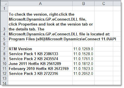 Once you have the file version number, you can open the Dynamics GP 2010 version list Excel file, go to the eConnect tab, and determine which eConnect service pack is installed.