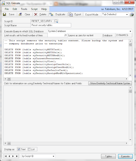 By saving the script ID we can reuse the code as many times as needed or for future resets. Note also, that I have used the Dexterity table notation in the DELETE statement as I already had the names in the XML Table Export window.