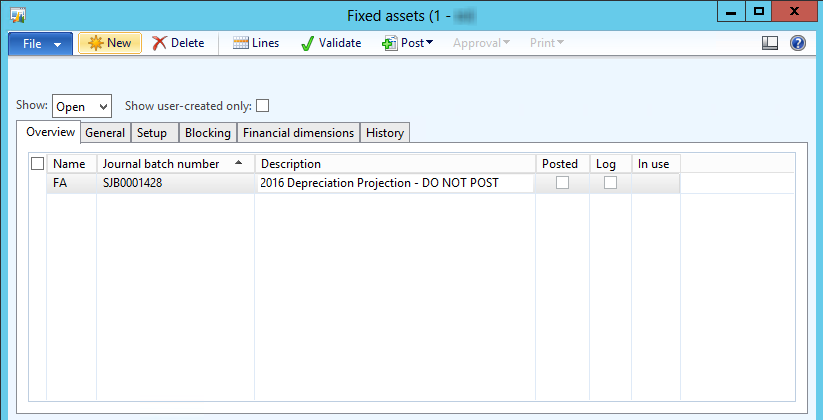 Step 2 - Click the Lines button, then Proposals>>Depreciation. Set the 'To date' to the depreciation end date. You can also filter the proposal by Fixed asset group and/or Value model. Click OK and sit back and wait for the proposal to generate.