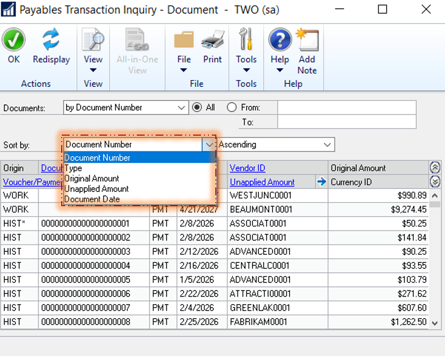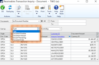 Another interesting feature that has been introduced with the release of Dynamics GP 2018 is the ability to sort results of the inquiry windows in both; the accounts receivable and the payable. The sorting option has been added to the following inquiry windows:
